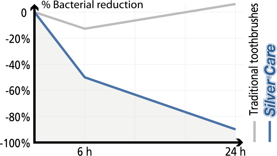 Silver Care is a toothbrush with a refillable head, the main feature of which is its antibacterial properties. The head of a toothbrush is the ideal place for the formation of bacteria and their proliferation. Water that remains between the bristles, a warm-humid environment and bacteria in a bathroom are critical elements for the rapid deterioration of a toothbrush’s hygienic conditions. The silver head of the Silver Care toothbrush, on contact with water, releases active ions that allow for a drastic reduction of the bacterial load that normally accumulates between the bristles. Silver Care therefore guarantees a higher level of hygiene than a traditional toothbrush.